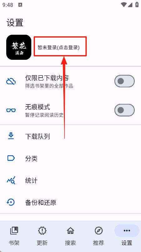 答1、点开推荐查看是否有图源,如果没有,备份书架,删除重新下载安装,第一次打开权限都允许。请点击观看教程备份与换源。
