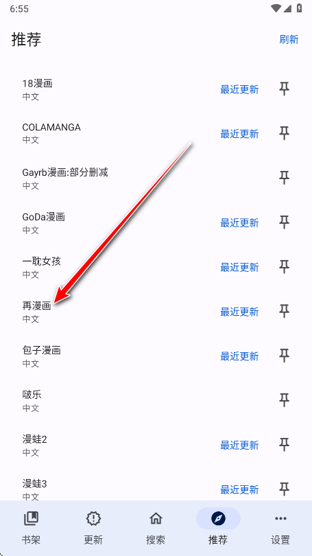 2.如下图所示,这款软件内置了很多漫画源,大家可以随意选择漫画源,小编以点击再漫画为例。