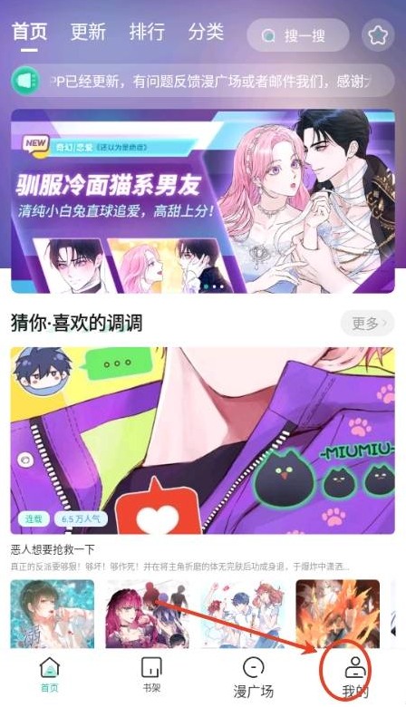 2、进入到软件首页,如图所示。软件会通过猜你喜欢为你推荐你感兴趣的漫画作品,