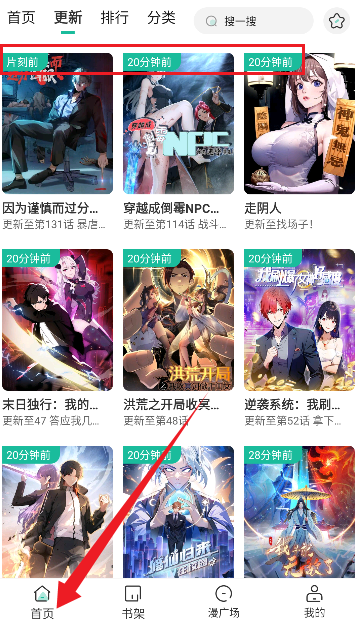 3、而且软件能实时更新漫画资源,如图所示,能看到时间为片刻前,或者20分钟之前更新的作品。