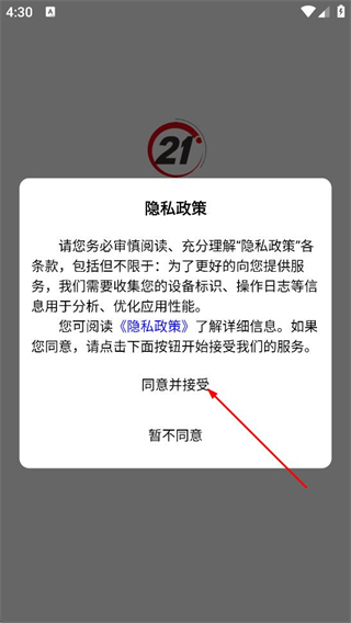 1、在隐私政策弹窗中,阅读隐私政策后。点击同意并接受。