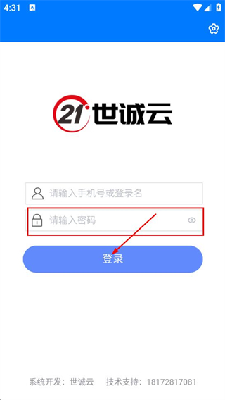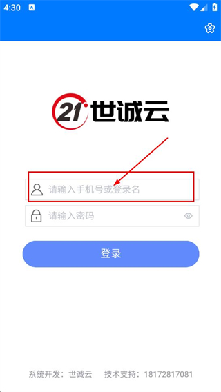 2、在世诚云登录页面,填写请输入手机号或登录名对应的内容。