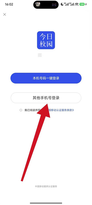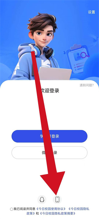 1、打开今日校园,勾选相关协议,点击登录区域的手机图标,切换至手机号登录模式。
