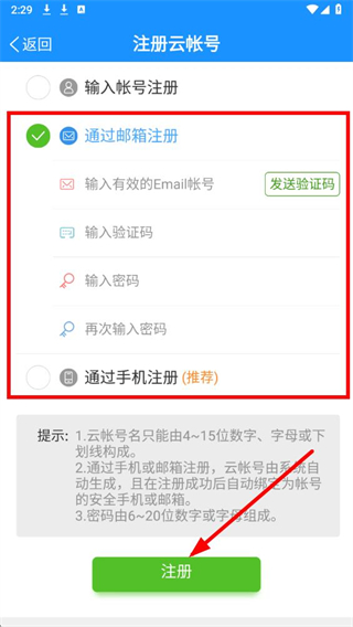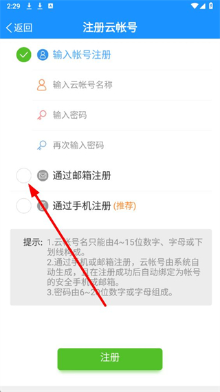 2、在注册页面,选择通过邮箱注册选项,切换至邮箱注册的信息填写界面。