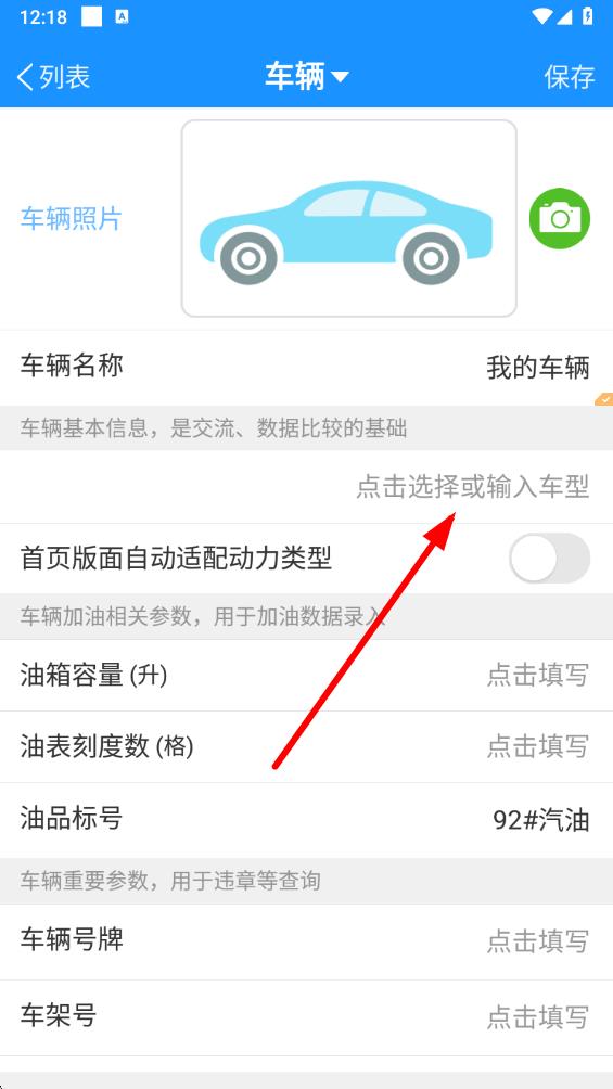 1、打开爱车记油耗版app,在首页点击我的车辆区域,进入车辆信息补充页面。