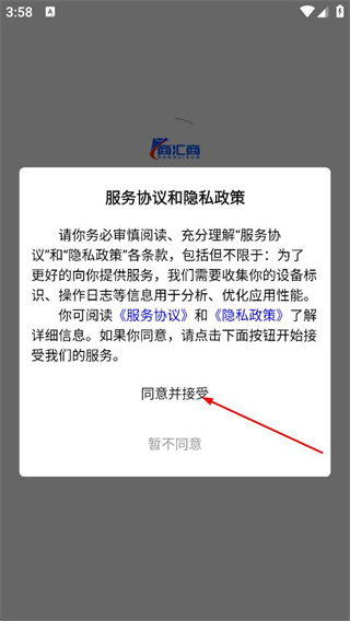1、在服务协议和隐私政策弹窗中,点击同意并接受按钮,进入页面。