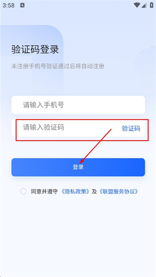 3、在验证码登录页面,点击验证码获取验证码后,填写验证码,再点击登录完成操作。