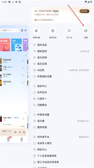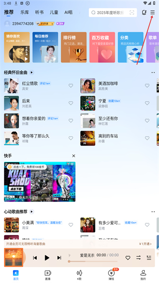 1、打开酷狗音乐主界面,点击右上角三个横线的功能图标,进入功能页面。