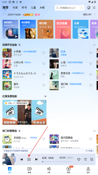 1、打开酷狗的APP,在首页点击要播放的歌曲。