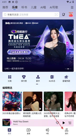 1、打开酷狗音乐APP,点击底部导航栏中的我的进入个人页面。