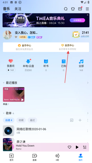 2、在个人页面中,按照红箭头指示找到并点击会员中心选项。