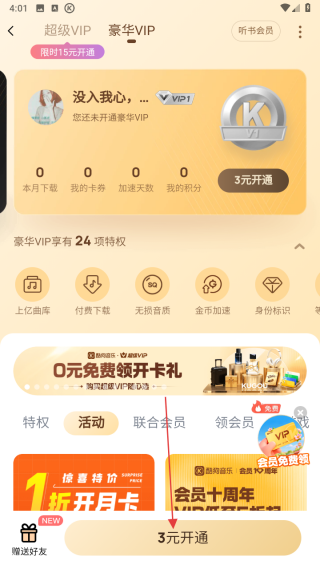 3、进入会员中心后,选择豪华VIP或其他会员类型,点击下方3元开通按钮,即可开通一个月的会员。