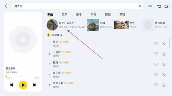 3、当搜索结果出来后,找到并点击歌手的区域位置。
