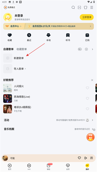 2、进入我的页面内,在自建歌单下点击新建歌单。