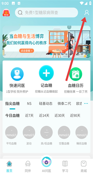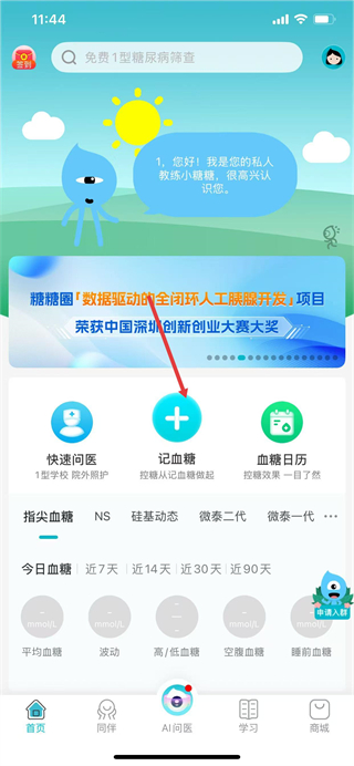 1、打开糖糖圈,在首页点击记血糖。