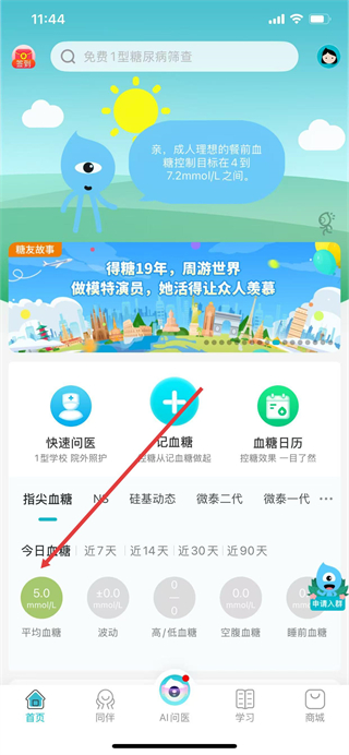 3、完成血糖记录,首页会显示刚记录的血糖数据。