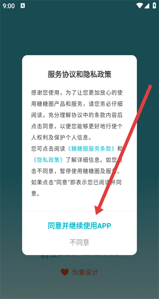1、点击同意并继续使用APP按钮,同意服务协议和隐私政策,进入糖糖圈APP主界面。