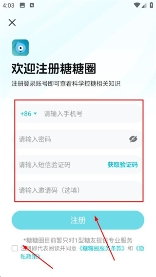 3、输入手机号、密码,获取并输入短信验证码,勾选后点击注册。