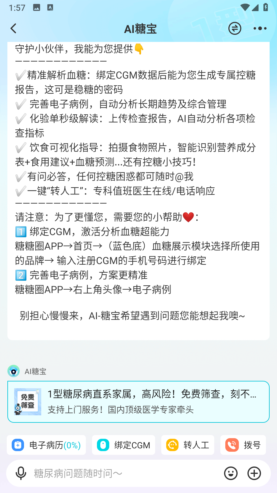 2、在AI糖宝界面,点击电子病历选项,进入电子病历页面。