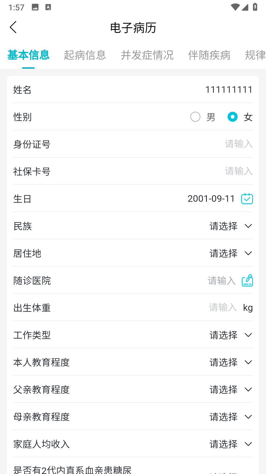 4、在信息填写界面,依次输入姓名、性别、身份证号等各项内容,完成电子病历的填写。