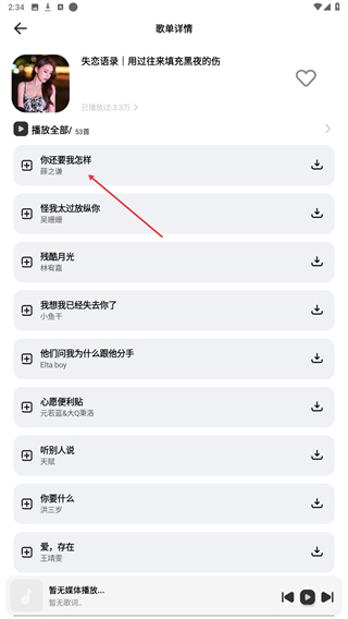 2、进入歌单详情页面内,选择并点击要播放的歌曲名称。