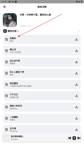 6、在这里能够收听到各种精彩的音乐,满足用户们多种的音乐口味喜好。