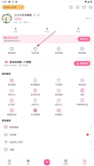 1、启动哔哩哔哩,点击底部导航栏的我的选项,进入个人中心页面。