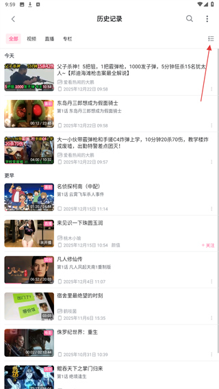 3、在历史记录页面,点击右上角的三个点图标,进入批量管理界面。