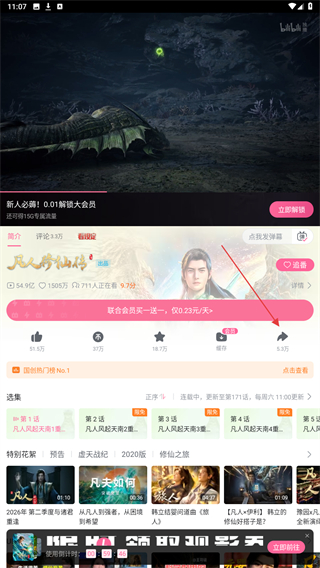 3、进入播放的页面内,用户需点击分享的功能按钮。