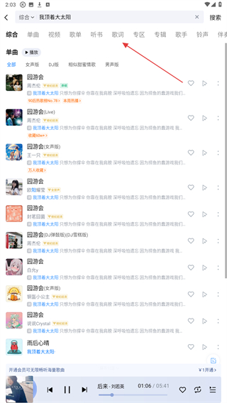 3、当搜索结果出来后,点击歌词的标签进行切换。