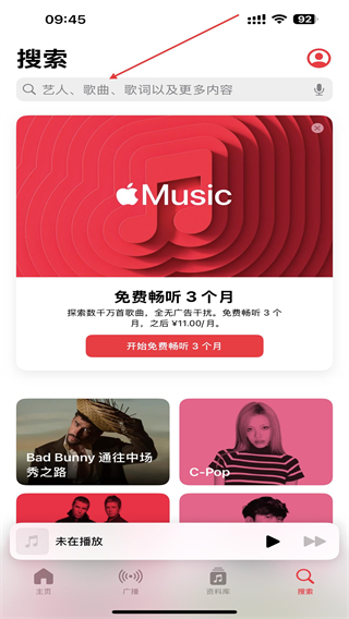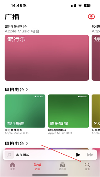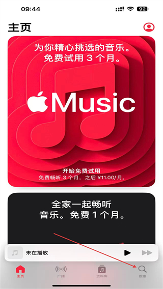 1、打开AppleMusic,进入首页点击右下方搜索的按钮。