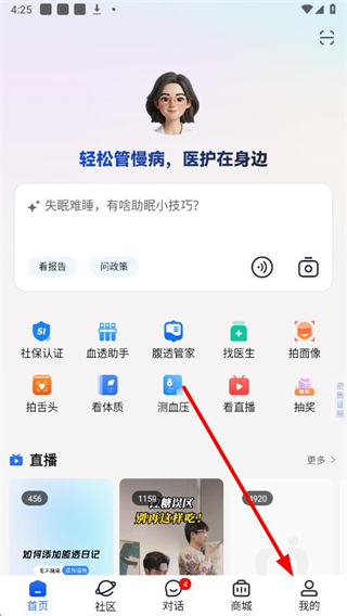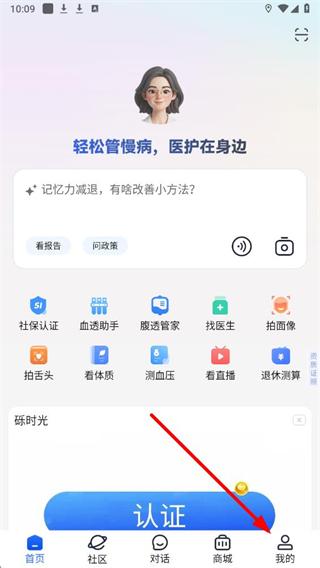 1、在老来健康应用的界面,点击底部导航栏右侧我的选项,进入对应页面。