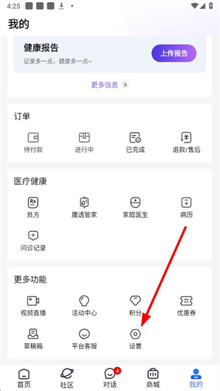 2、在我的页面中,找到更多功能区域里的设置选项,点击进入设置页面。
