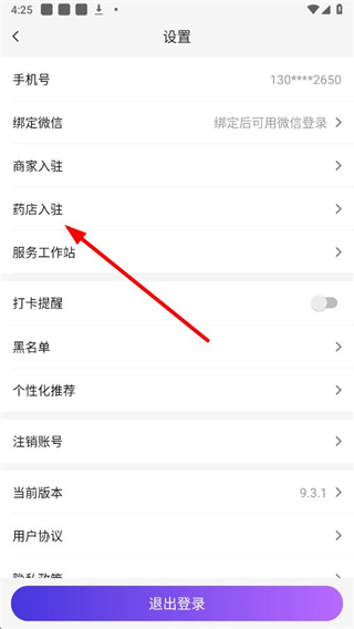 3、在设置页面的列表中,找到药店入驻选项并点击进入对应界面。