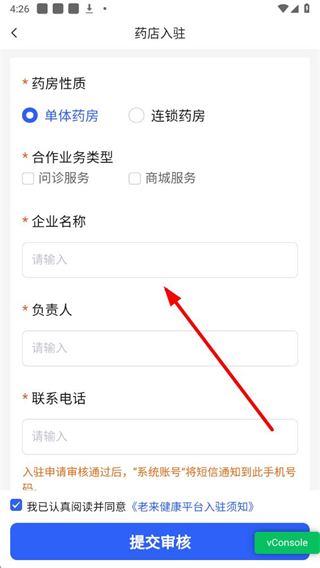 4、在药店入驻界面,选择药房性质、勾选合作业务类型,填写企业名称等信息后提交审核,完成入驻申请。