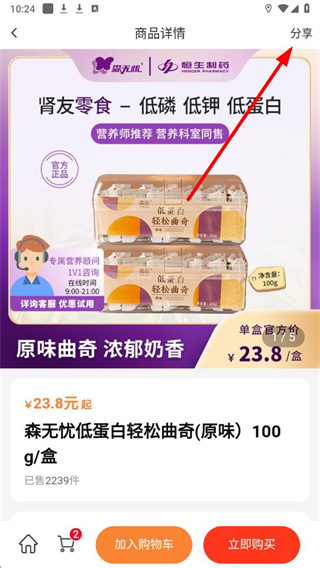 3、在商品详情页右上角,点击分享按钮,弹出分享选项弹窗。