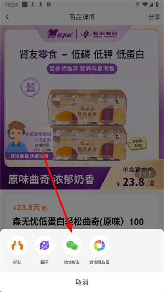 4、在弹窗中,选择微信好友或微信朋友圈,即可将该商品分享到微信对应渠道。