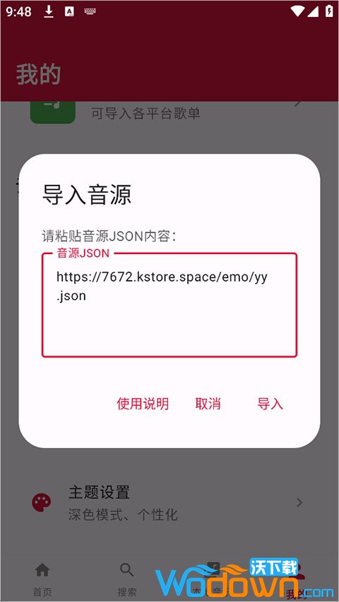 在【我的】界面点击【音源导入】,粘贴链接并点击【导入】。
