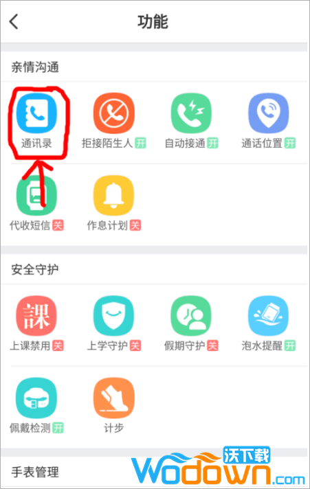 在功能页中找到 通讯录 部分并点击。