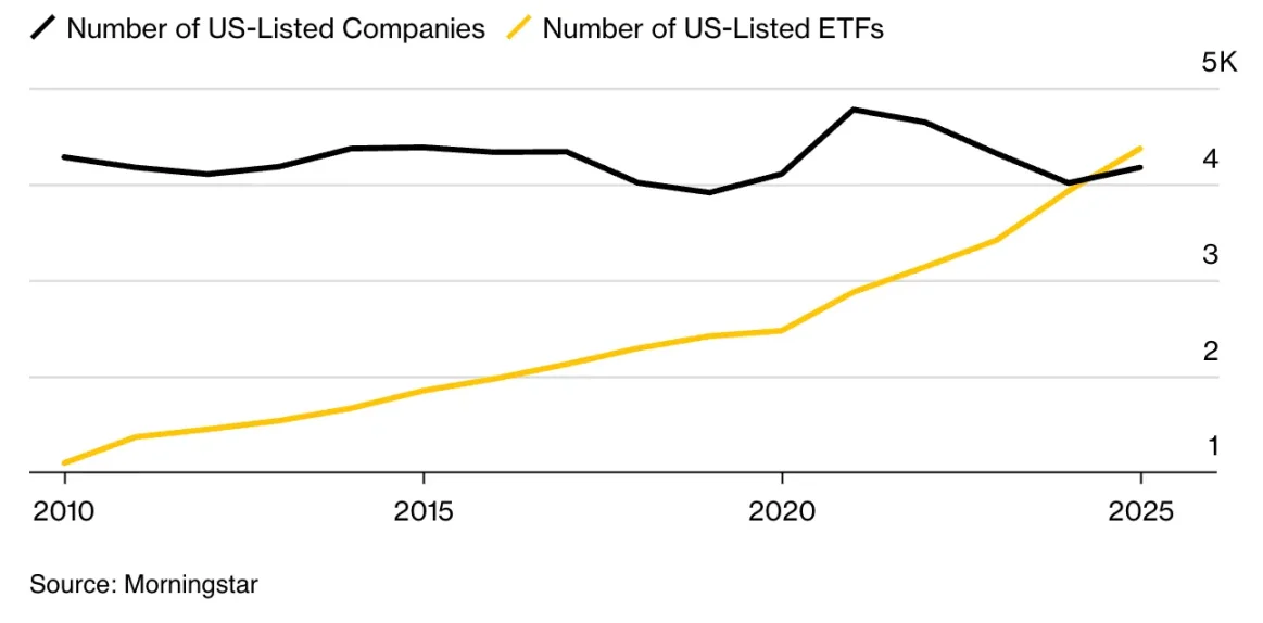 如今,美国市场的 ETF 数量已超 4300 只,而公开上市公司仅约 4200 家。ETF 在所有投资工具中的占比从十年前的 9% 升至 25%,这是市场史上首次出现「基金数量多于股票数量」的情况。