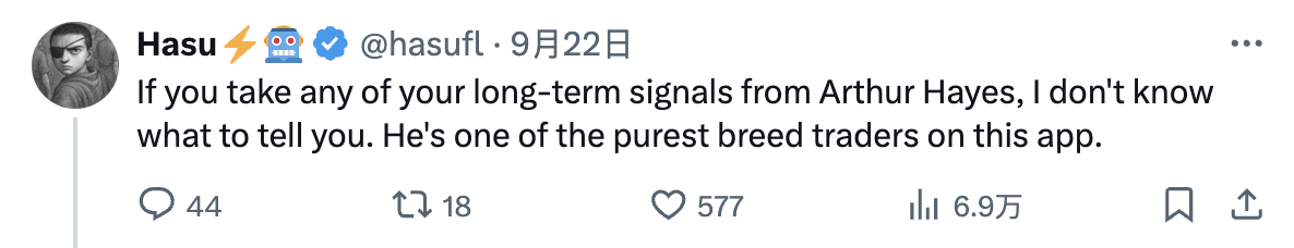 Flashbots 战略主管 Hasu 就曾点评 Arthur Hayes 表示:「如果你从 Arthur Hayes 那里获取了任何长期信号,我真不知道该对你说些什么。他是这个市场上最纯粹的交易员之一。」