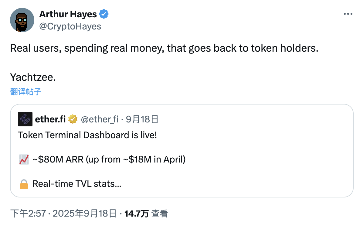 9 月 18 日下午 3:00 左右,Arthur Hayes 还在和自己的投资项目 ether.fi 热情互动,赞扬后者的经济模型能够让价值回流到 ETHFI 的持币者手中。