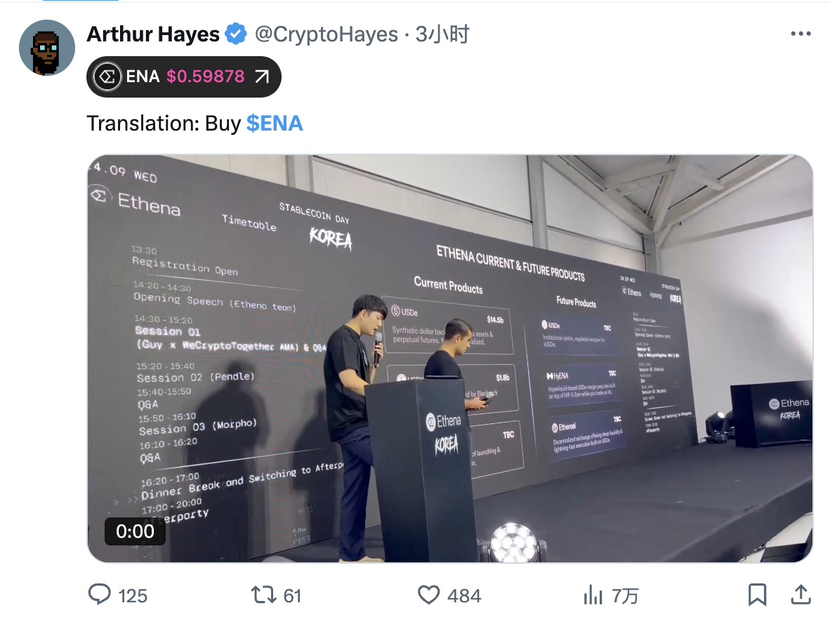要说 Arthur Hayes 的经典逃顶案例,ENA 绝对值得一提。