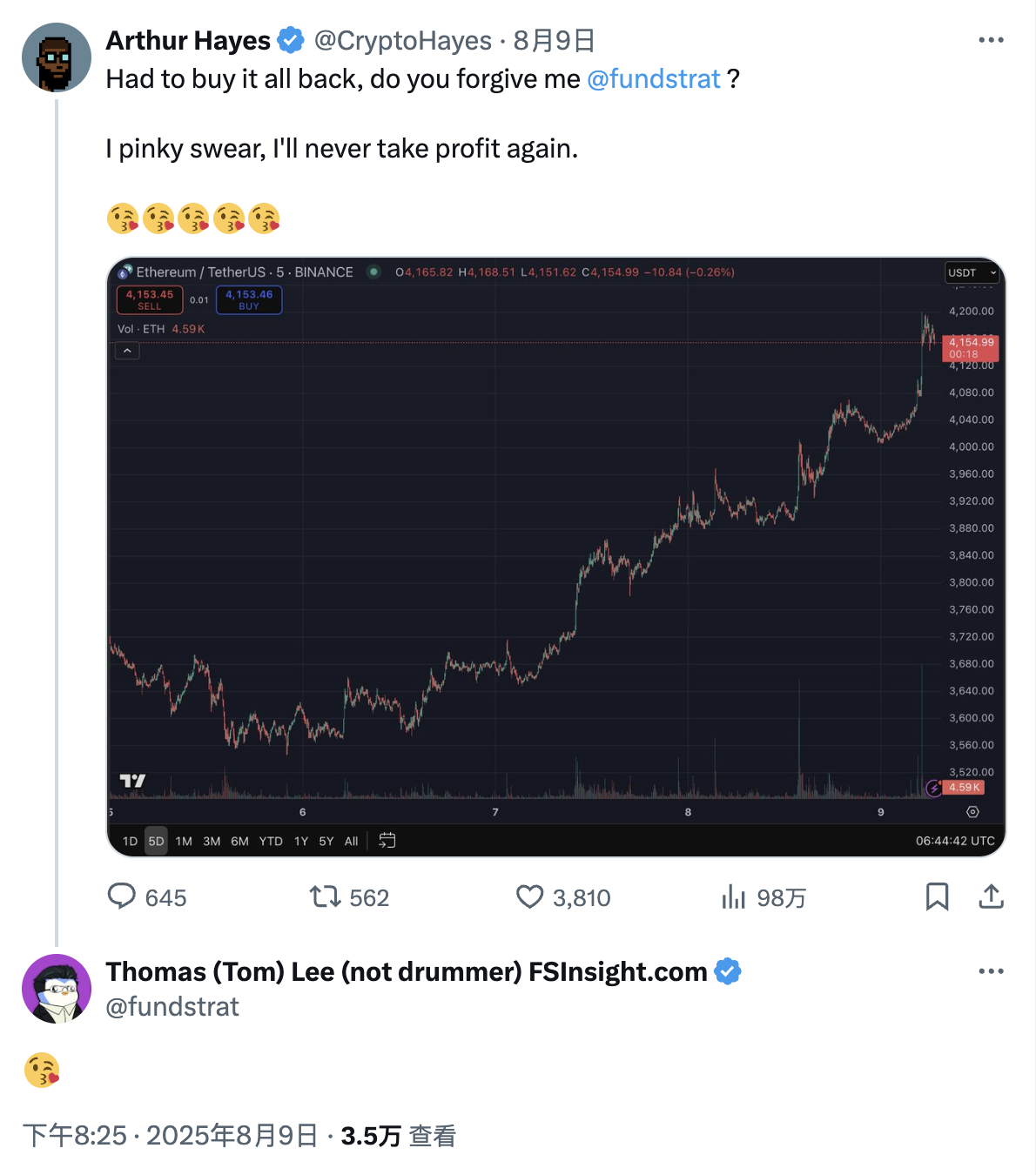 在本轮 ETH 强势上冲期间,Arthur Hayes 曾多次试图逃顶,但最终却被市场「以涨服人」,被迫提价全仓接回。