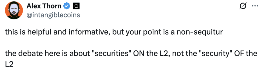 Galaxy 研究主管 Alex Thorn 认为 Vitalik 的观点并没有切中要点,其表示,讨论的重点应是 L2 上的证券(securities),而不是 L2 的安全性(security)。虽然 Alex Thorn 没有明示,但其观点却指向了一个非常致命的问题:L2 本身并非交易平台,但如果 L2 上的交易平台是建立在一个非常中心化的链上,那么这些交易平台是否还能被称为 DEX 以及是否应该受到监管?