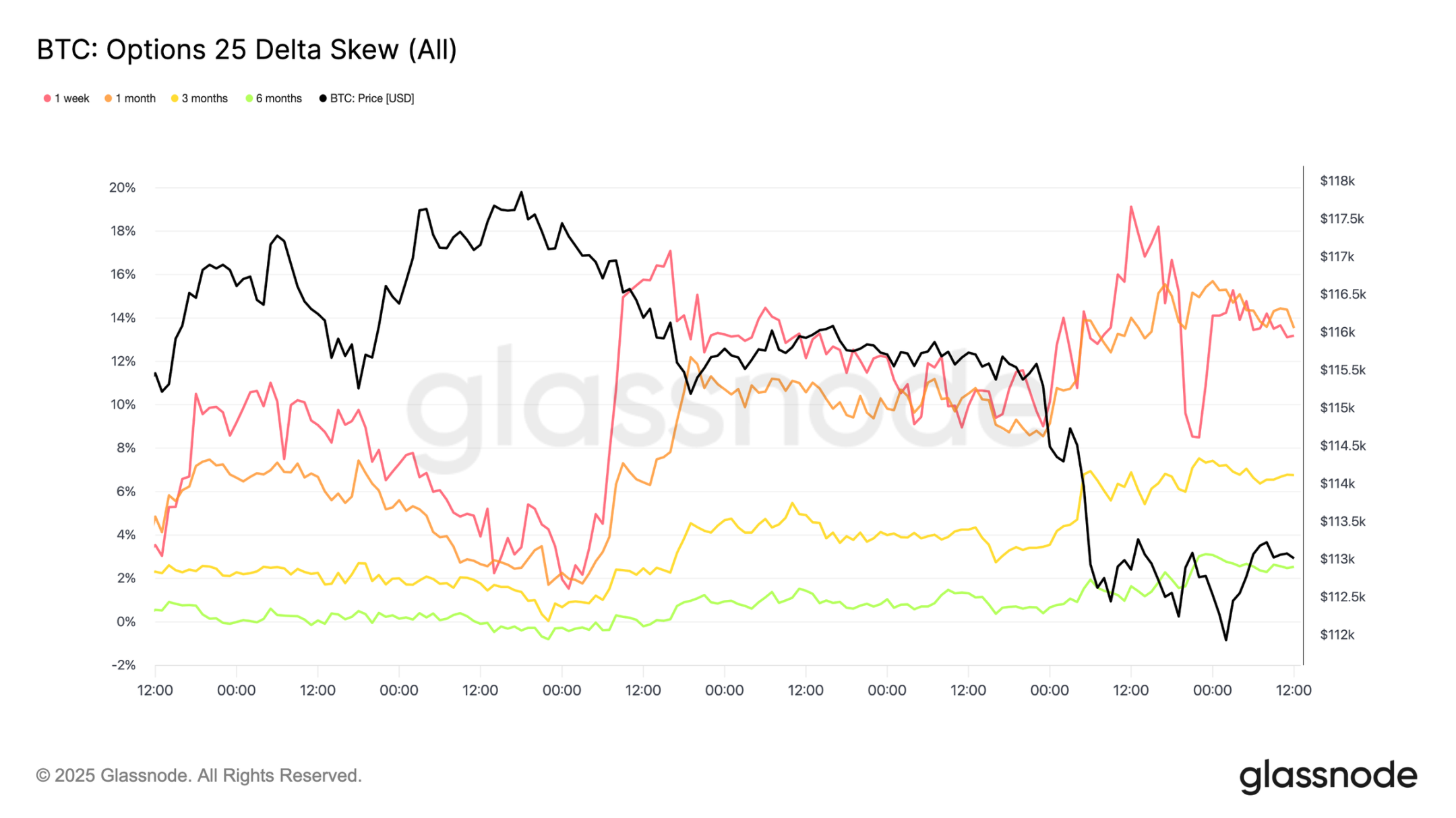 抛售之后,看跌 / 看涨期权成交量比率呈下降趋势,因为交易员锁定了价内看跌期权的利润,而其他交易员则轮动到更便宜的看涨期权。短期和中期期权仍然严重倾向于看跌期权,使得下行保护相对于上行而言成本高昂。对于对年底持建设性观点的参与者来说,这种不平衡创造了机会——要么以相对较低的成本积累看涨期权,要么通过卖出价格高昂的下行风险暴露来为其融资。