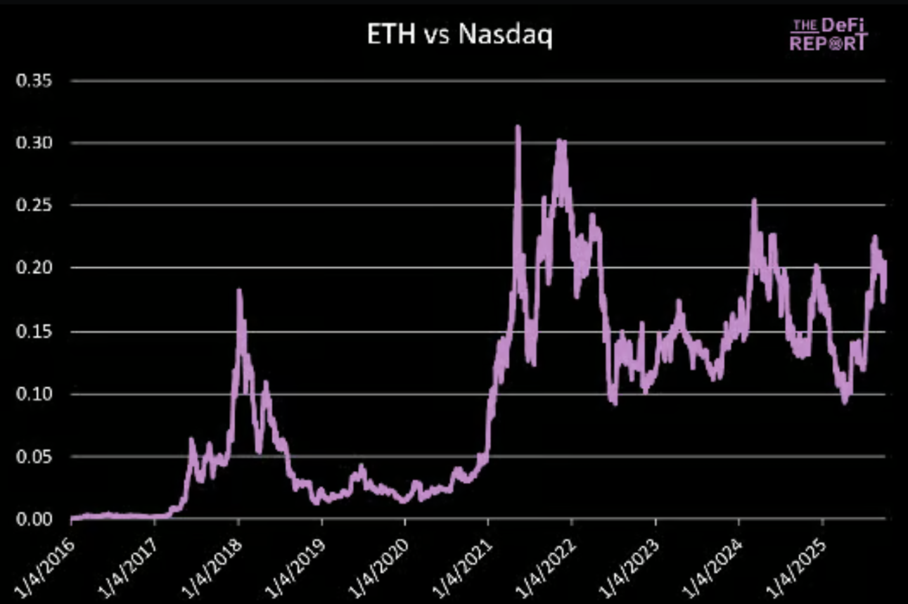 2021 年 5 月和 11 月,以太坊与纳斯达克指数的比值峰值分别为 0.31 和 0.30。