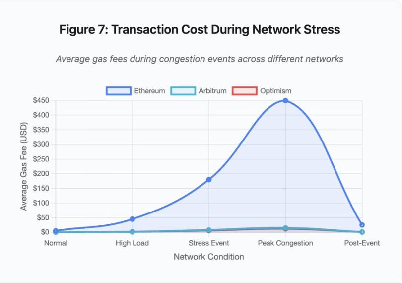 这张折线图戏剧性地显示了压力事件期间各网络的 Gas 费升级: