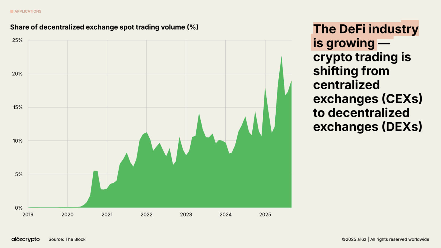 曾经仅是早期采用者小众试验场的链上经济,已演变为拥有数千万月活参与者的多元生态。如今近五分之一的现货交易量通过去中心化交易平台完成。