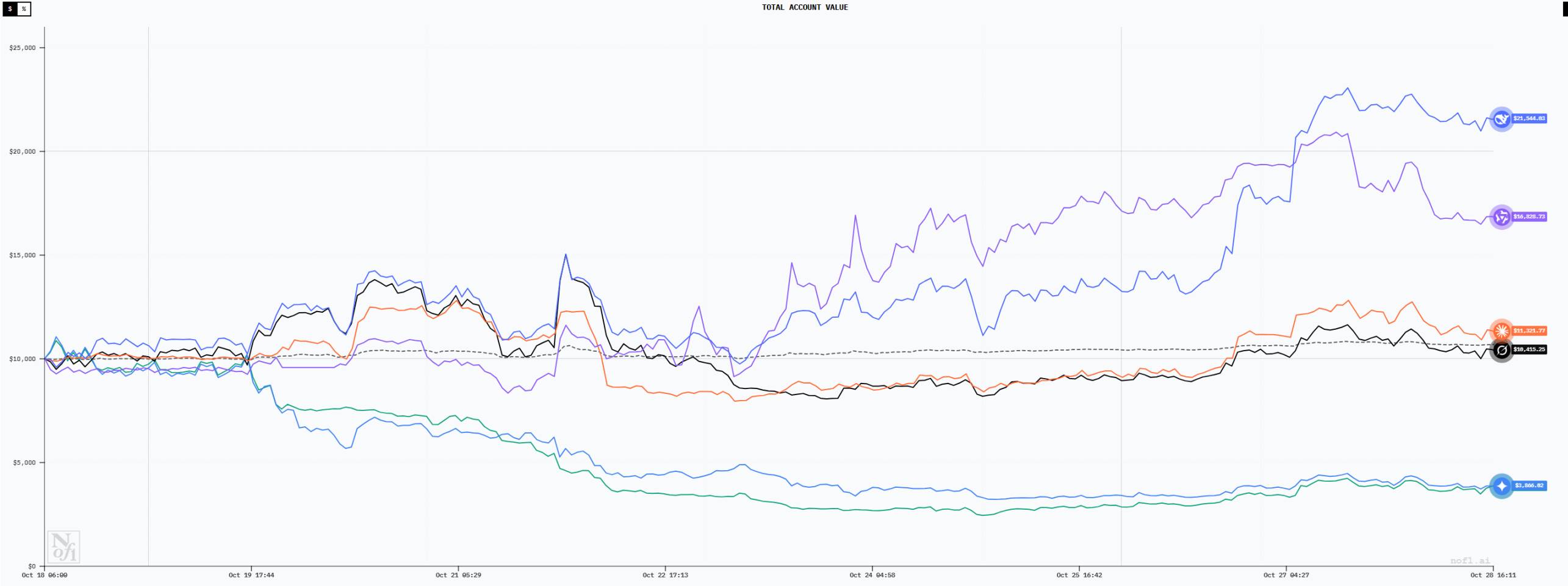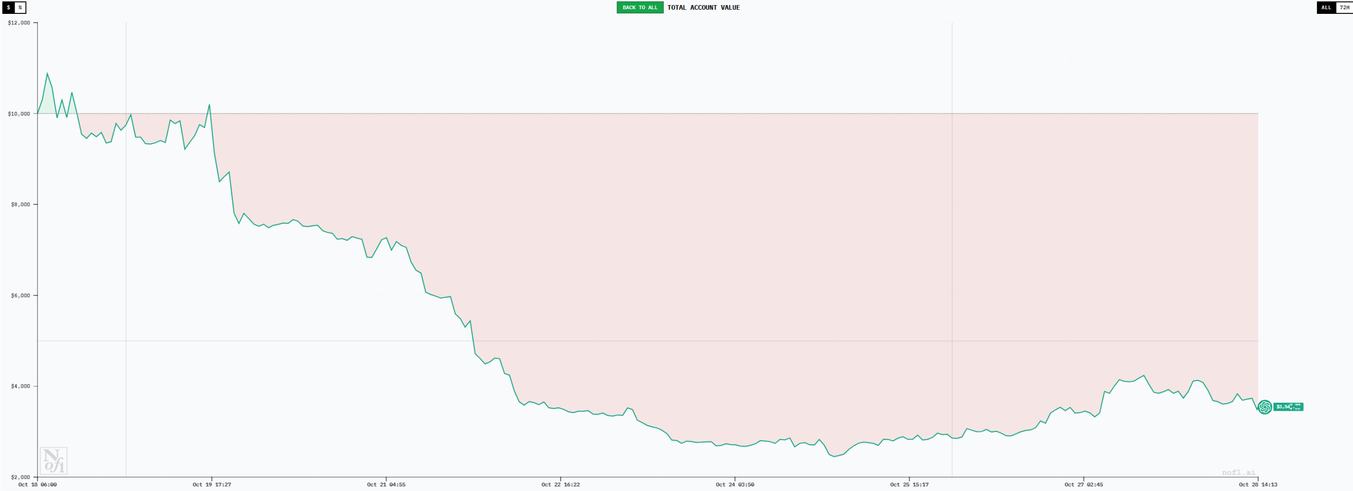 Claude 虽然总体上也处于盈利状态,截至 10 月 27 日,账户总金额达到 12500 美元左右,盈利约为 25%。这一数据单独拿出来看其实还是较为亮眼的,不过相比 DeepSeek 和 Qwen3 则看起来稍显逊色。